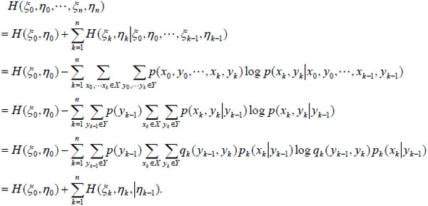 be a hidden inhomogeneous Markov chain defined as above and H (ξ0 , η0 , ···, ξn, ηn) be the entropy of ζ. The entropy rate of ζ is defined by